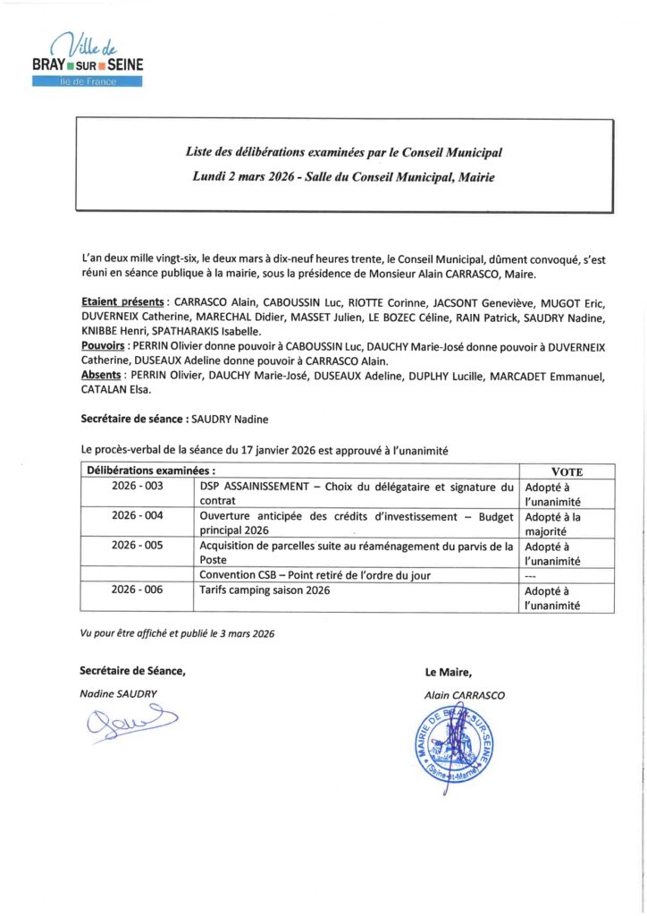 Liste des délibérations examinées en séance de Conseil le 2 mars 2026