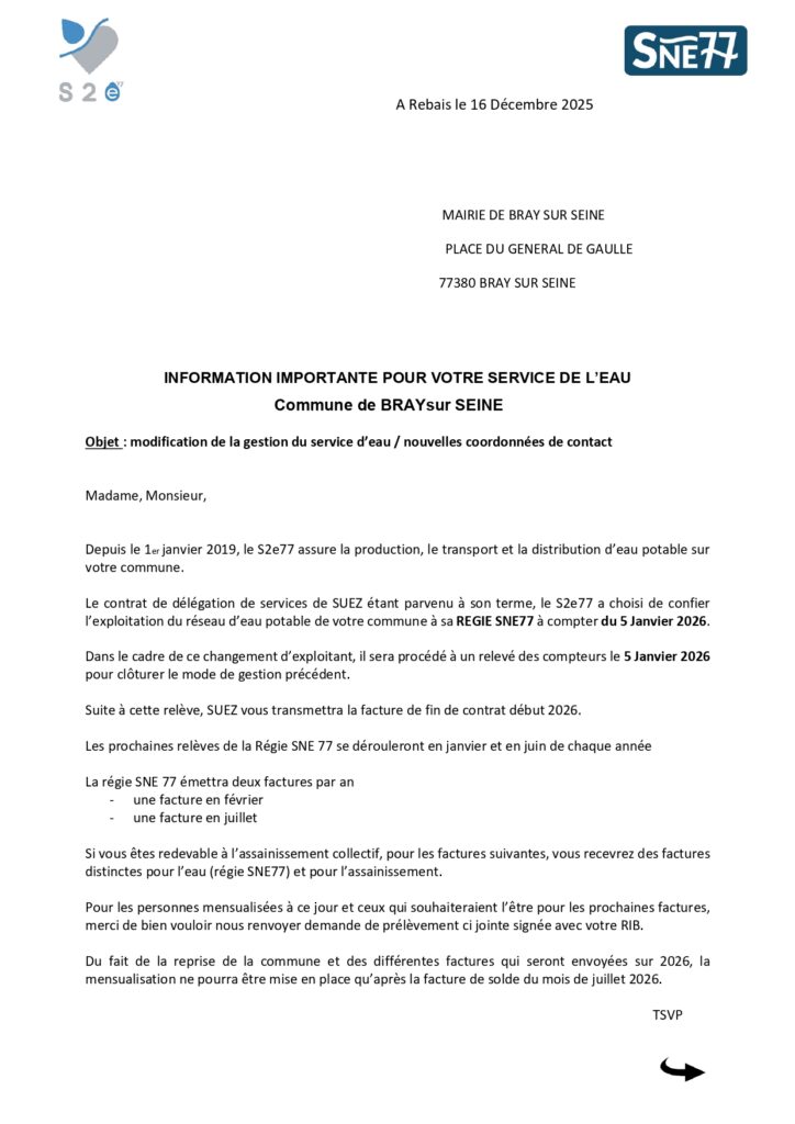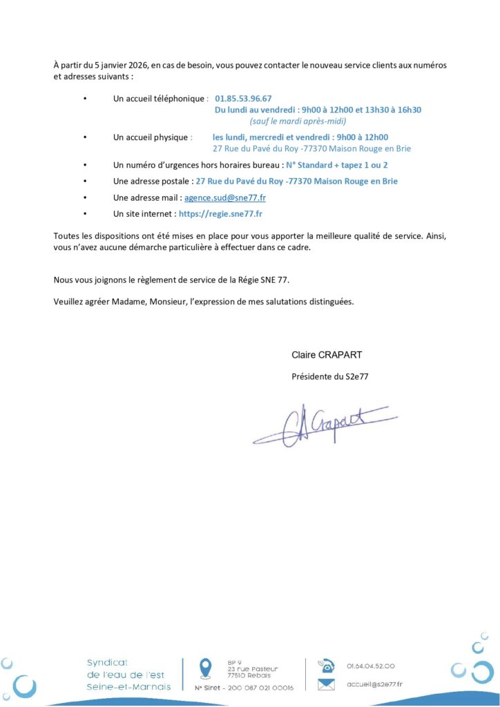 Comme indiqué dans votre courrier, l’entreprise SUEZ vous transmettra une facture suite à un relevé des compteurs qui aura lieu le 5 janvier, puis ensuite, les factures seront faites par REGIE SNE77